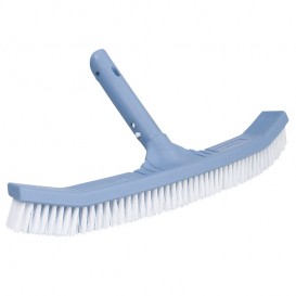 Cepillo de fondo Shark ideal para la limpieza del fondo y paredes de la piscina por sus grandes dimensiones y forma especial curva. Fabricado en polipropileno de color gris tiburón y acabado rugoso. Cerdas de polipropileno blanco y azul.