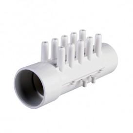 Distribuidor de aire de 10 salidas para embridar a tubería de 10 mm de diámetro interior y encolar a tubería de 50 mm.