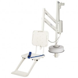 Silla de instalación semi-portátil en la playa de la piscina para minusválidos. Carro para transportar la silla incluido para facilitar su instalación en diferentes localizaciones. Para su instalación se requiere un anclaje al suelo. Su batería recarga bable de 24 V alimenta un actuador metálico, asegurando que el equipo siempre esté listo para su uso. Duración de 30 ciclos una vez cargada. Mando de control resistente al agua. El elevador Splash va equipado con una estructura de materiales resistentes al agua para evitar la corrosión, reposa brazos y reposapiés. Su capacidad de carga de 136 kg y su radio de maniobra de 359º la convierten en una de las soluciones más prácticas para que un minusválido acceda a la piscina.