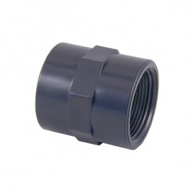 Manguito unión doble rosca PVC roscar fabricado por Cepex (UP. 05. FT). Los manguitos de PVC-U permiten enlazar tramos de tubería, en este caso con conexiones roscadas (rosca hembra) en ambos extremos. Disponible en medidas desde 3/8″ hasta 4″.