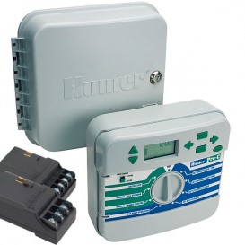 Programador modular de 3 estaciones, ampliable hasta 15 mediante módulos de 3. 2 versiones disponibles: una para instalación en interiores (i) con transformador enchufable, y otra para exteriores. Tres programas y cuatro inicios de riego por programa. Calendario de 365 días. Hasta tres solenoides simultáneos (salida 1 Amp). Detección electrónica de corto-circuitos. Programación y reloj permanente no-volatil. Compatible con sistema IMMS, control remoto ROAM e ICR.